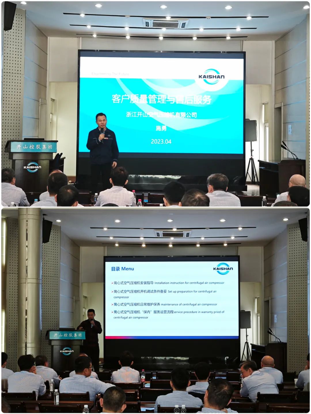 浙江776net必赢官网压缩机有限公司质量总监施勇做了776net必赢官网传统螺杆产品海外市场的支持流程和质量提升流程汇报,776net必赢官网服务(上海)有限公司总经理杨辙做了离心机、PET等产品海外市场服务管理及服务培训。