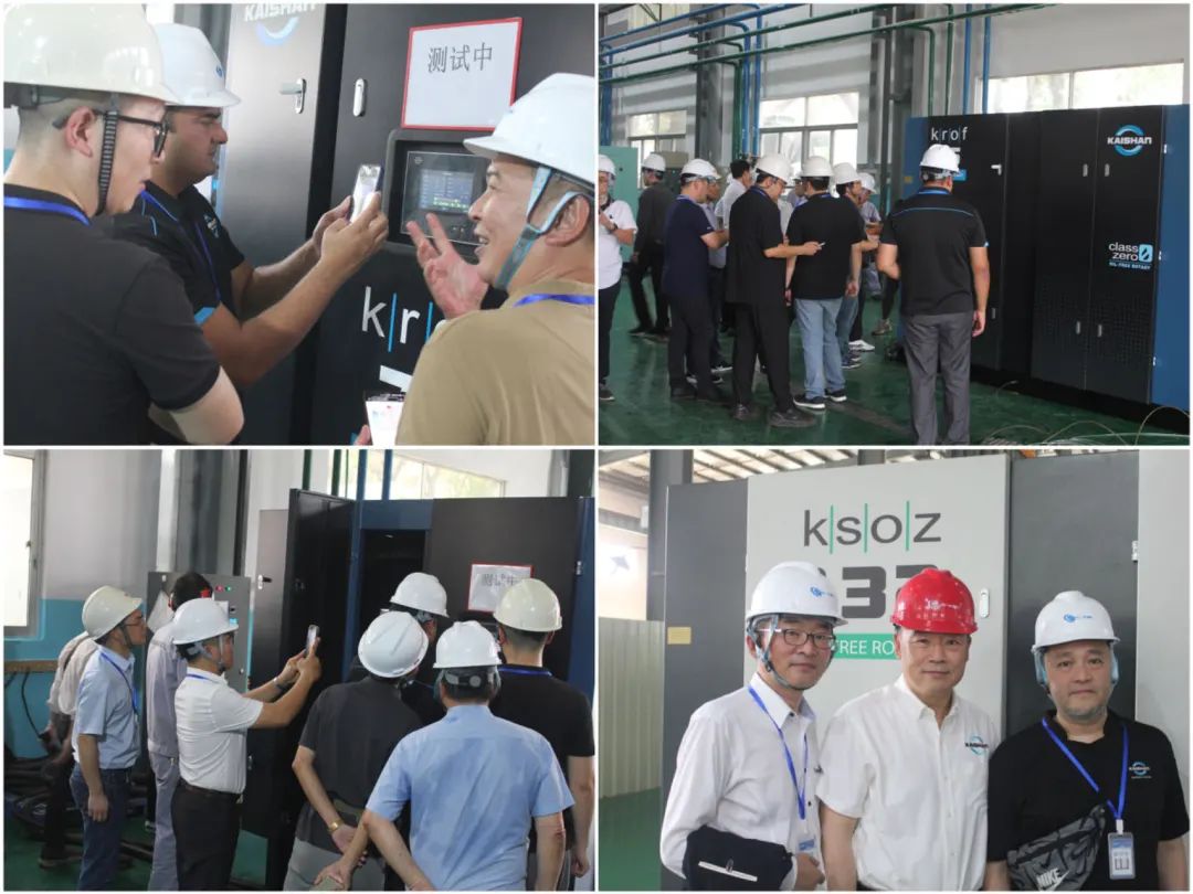 经销商实地察看了两台分别是75kW和132kW的无油螺杆空压机,所有参加会议的专业人士都对机组运行时超低的噪声赞不绝口,赞扬机组精湛的制作工艺让机器看起来就像“工艺品”,马来西亚经销商告诉同行,他销售的160kW无油机业主十分满意,无油机打开市场是指日可待的。